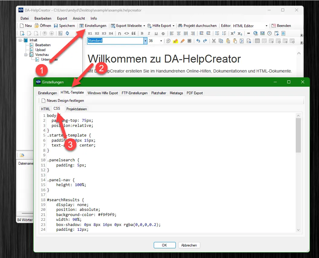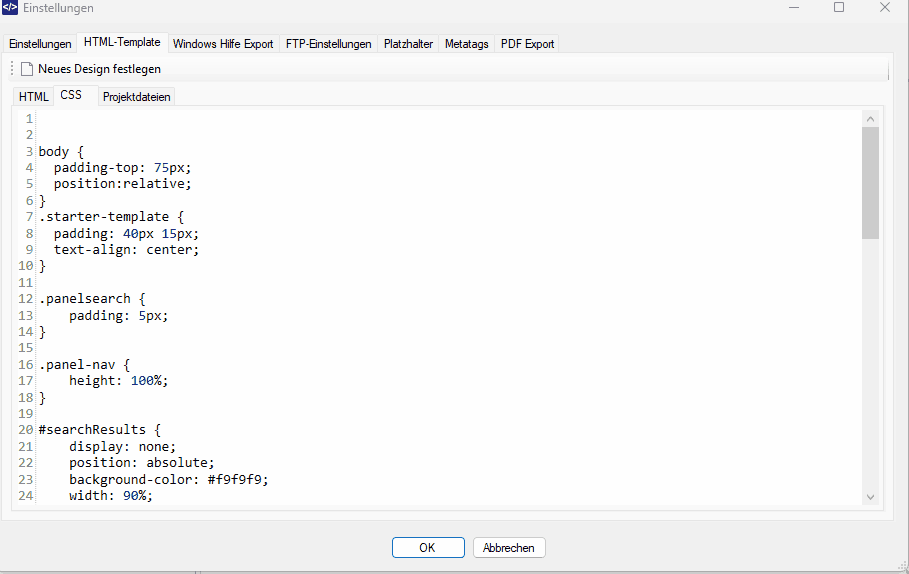 Die geht in DA-HelpCreator mittels CSS-Formatvorlagen. Hierzu öffnen wir die Einstellungen, das HTML-Template und hier den Reiter CSS.