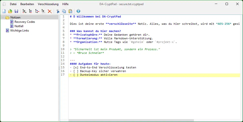DA-CryptPad ist ein textbasierter Outliner für Windows und Linux. Organisieren Sie Ihre Notizen, Passwörter und vertrauliche Informationen in einer übersichtlichen Baumstruktur – sicher verschlüsselt auf Ihrer Festplatte.