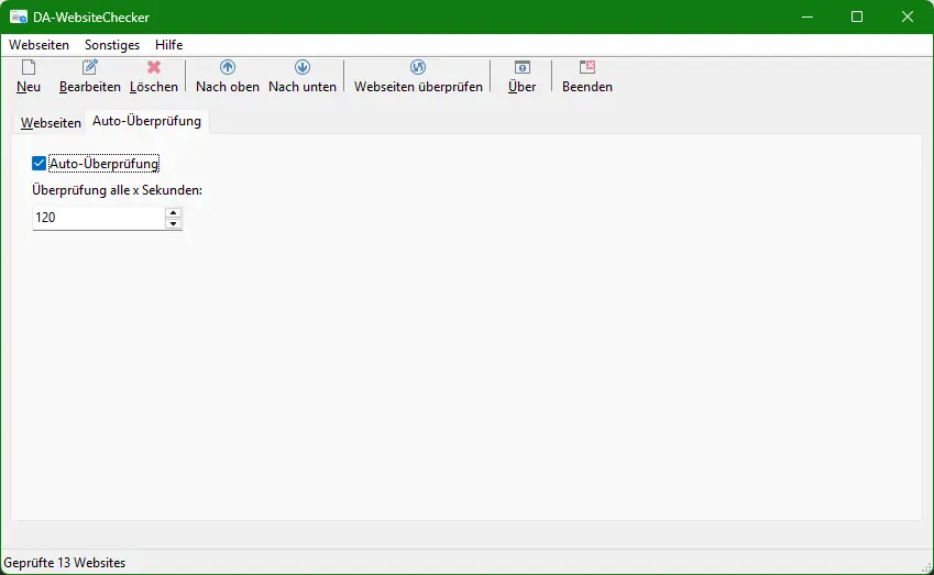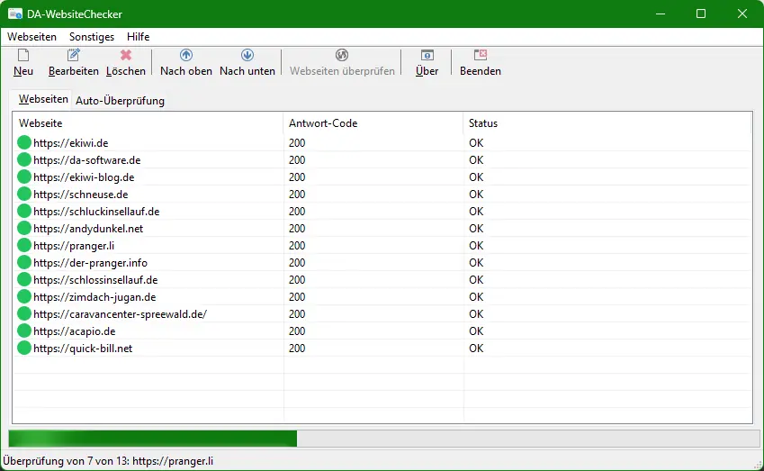 Die übersichtliche Benutzeroberfläche zeigt alle eingetragenen Webseiten samt Status auf einen Blick.